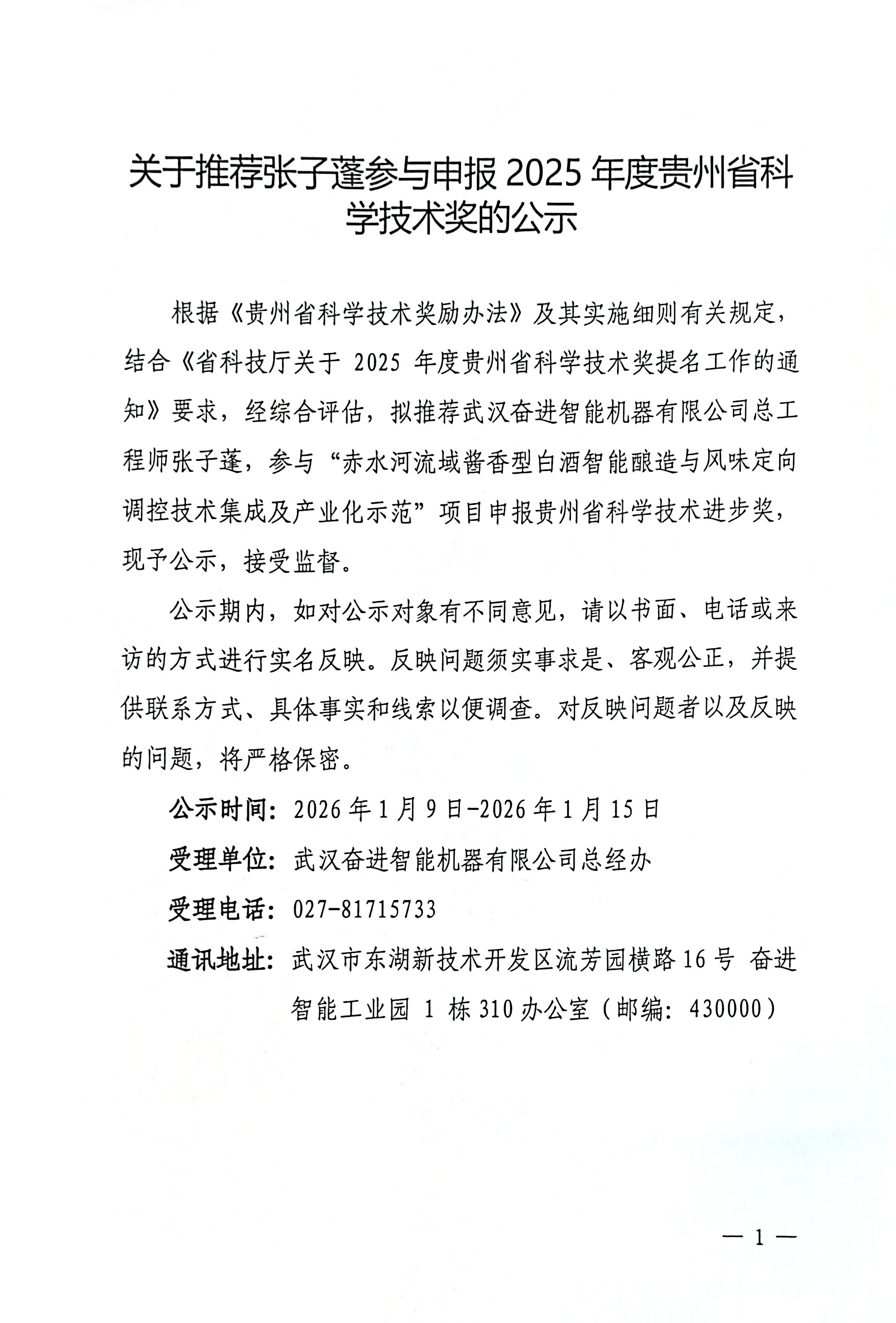 關于推薦張子蓬參與申報2025年度貴州省科學技術獎的公示